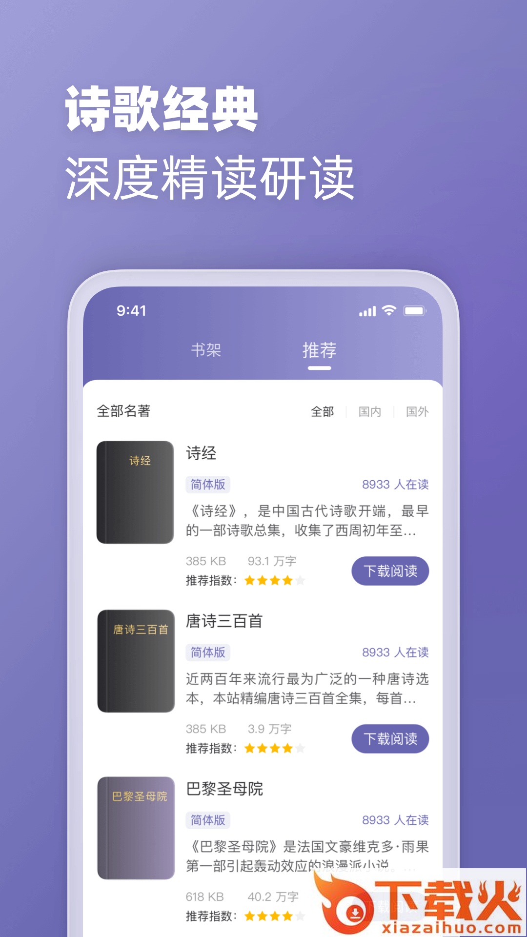 3.收藏了国内外经典诗词、诗歌典籍名著经典,下载之后即可在线阅读;