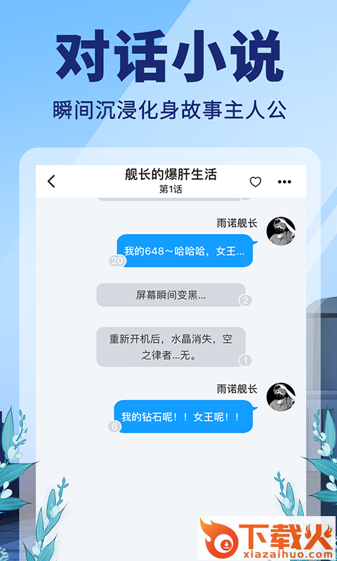 年轻人都在玩的对话小说APP,看小说就像QQ/微信聊天一样有趣,点击屏幕弹出对话,瞬间代入剧情,各种图片表情包,好玩到根本停不下来!全新时代,我们与众不同,开辟出全新的小说阅读快感,邀你一起,点呀点鸭!
