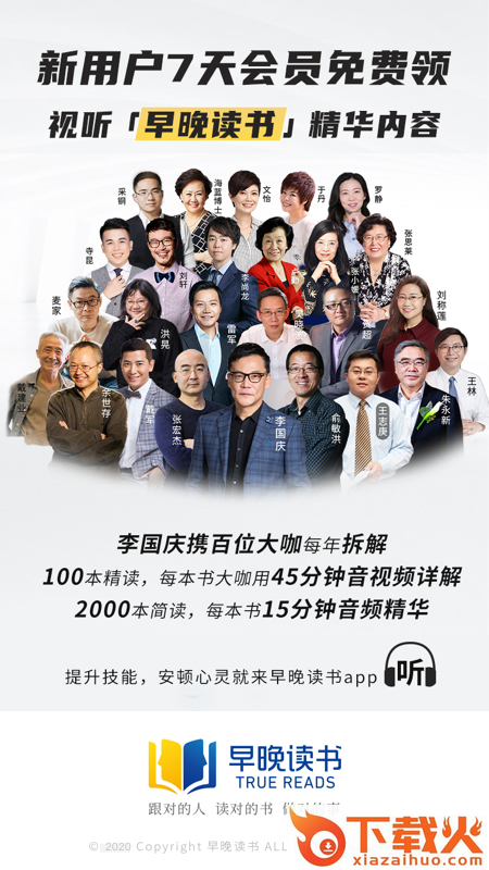 早晚读书由当当网创始人李国庆先生发起,通过移动互联网的方式共建学习型社区,汇集几十位大咖的精华输出,一年50本精选书籍,通过音视频方式,让每位用户都能享受读书的乐趣。