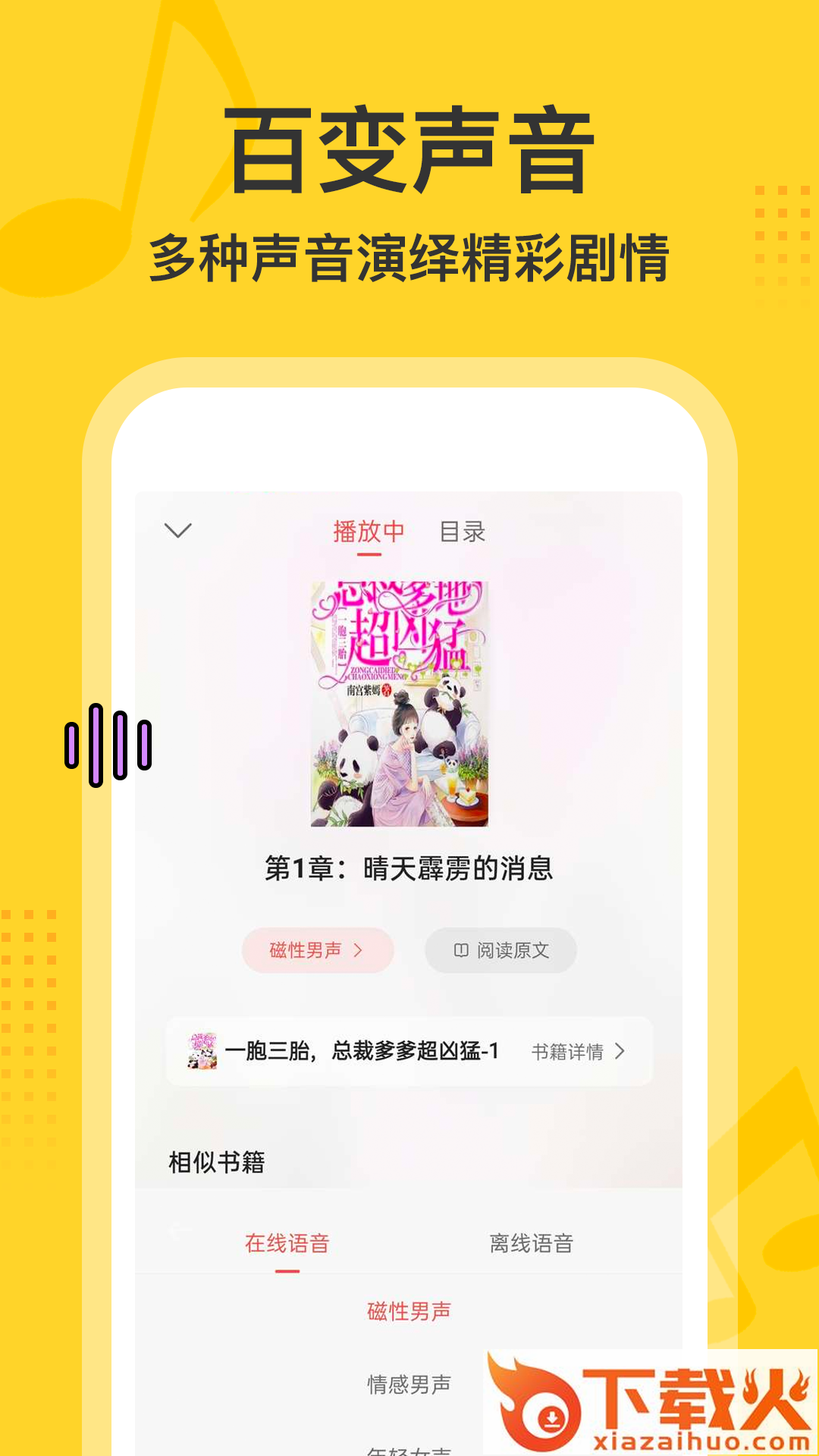 支持切换不同声音,磁性男声、温柔女声....,给你别样的听书体验。