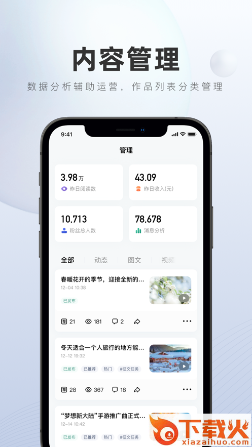 百家号App让创作者能在手机上便捷的管理和发布文章、图集、视频等内容,查看内容和收入数据,以及实时接收平台公告和消息。