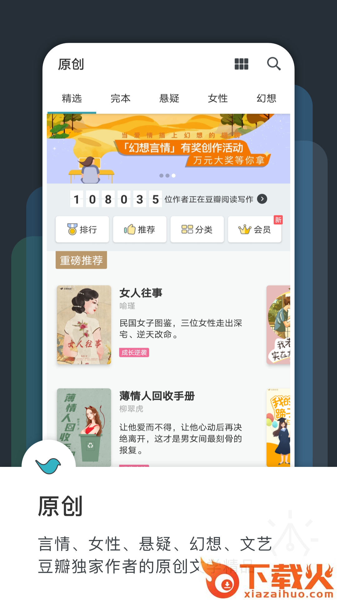 • 悬疑、女性、幻想、文艺、历史五大频道,拥有豆瓣评分 8.0 以上的优质小说,经过豆瓣读者数据检验。