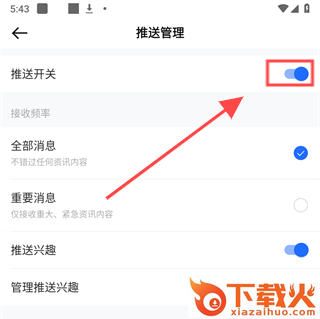 3、进入推送管理界面,点击推送开关后方的【开关】按钮即可完成关闭操作