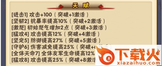 天赋上看,有加生命加攻击加怒气加伤害减免,有自身属性的提升更有团队增益的buff,身为橙卡拥有极高的资质,实在是不可多得的好英雄。