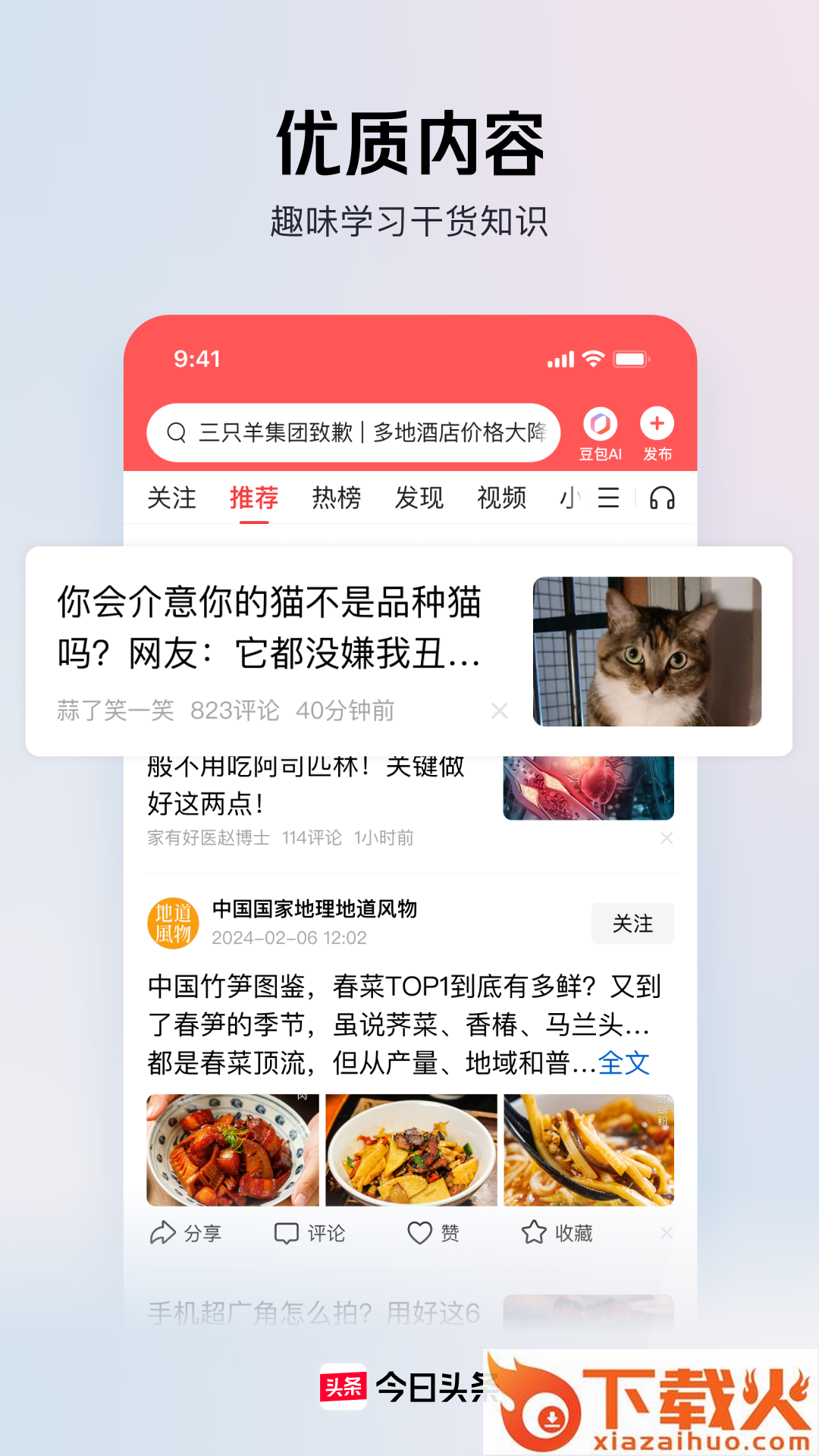 今日头条安卓版是一款手机资讯应用,真正社交化的资讯阅读,便捷地看到你最感兴趣和最热门的资讯,和朋友互动,发表对世界的看法吧。颠覆传统阅读――人搜索资讯的模式,运用大数据算法,精准推荐你感兴趣的内容,从...