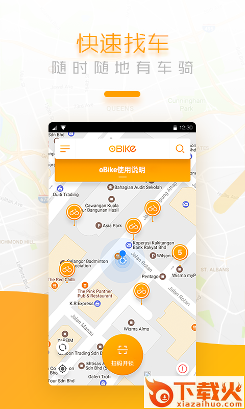oBike是新加坡共享单车的开锁软件,想要在新加坡使用oBike共享单车,就必须要使用这款软件哦,使用oBike app,还有里程记录,一键查询周边oBike共享单车等功能,觉得这款软件还不错的小伙伴快来下载吧!