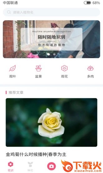 除了扫码识花的核心功能外还有识花、种花、花语等围绕绿植和花类展开的相关知识,
