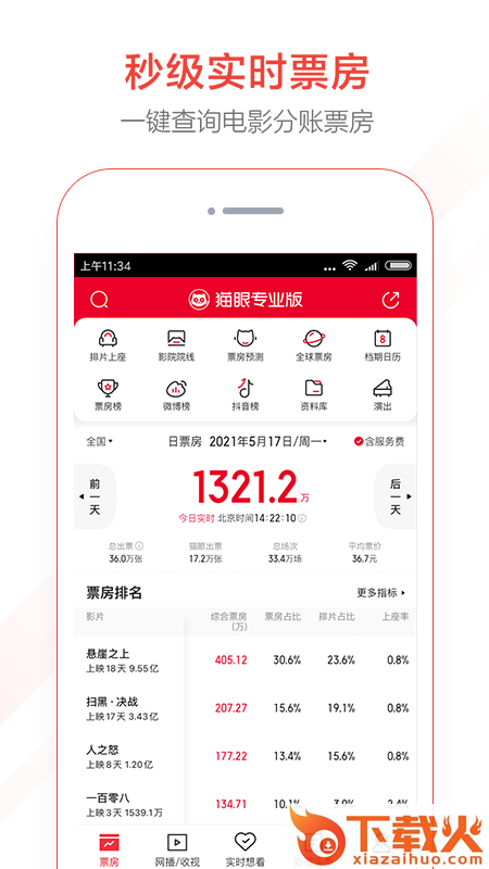 10.影院实时票房:更及时,更丰富,定位到影院!帮助影院经理知己知彼,更准确的制定经营决策;