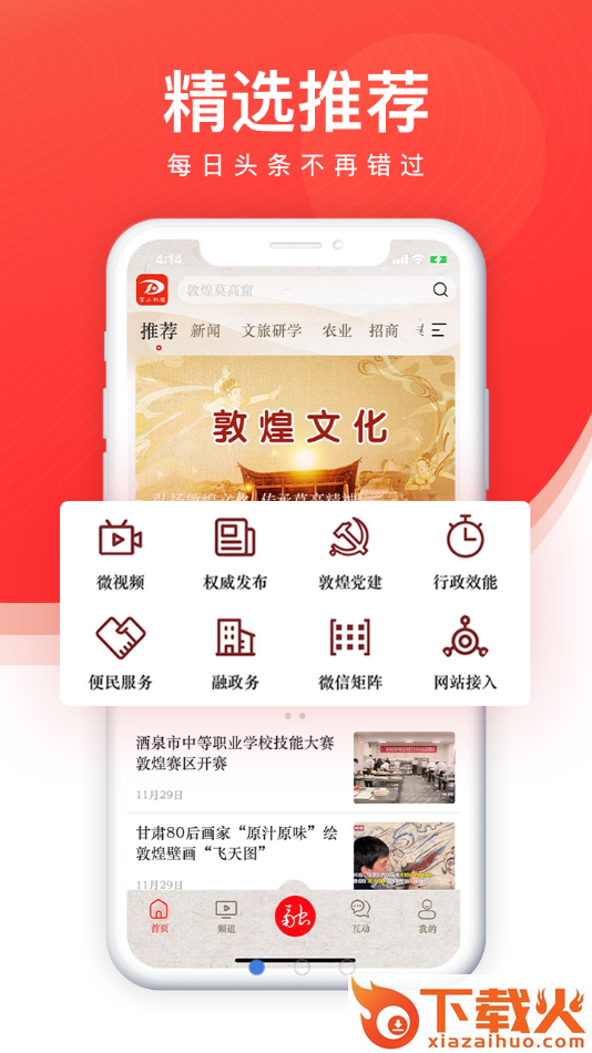 掌上敦煌app是敦煌广播电视台推出的融媒体移动平台,软件拥有新闻,党建,政务,节目,发现,直播,便民等等诸多功能内容,可以帮助更好的引导及服务敦煌。