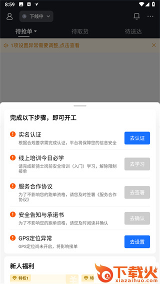5、完成实名认证、线上培训今日必学、服务合作协议、安全告知与承诺书、GPS定位异常等步骤,即可开工