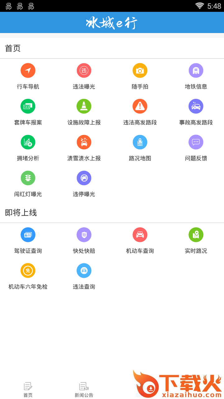3、系统由五大模块组成:出行服务、业务办理、新闻公告、警民互动和个人中心