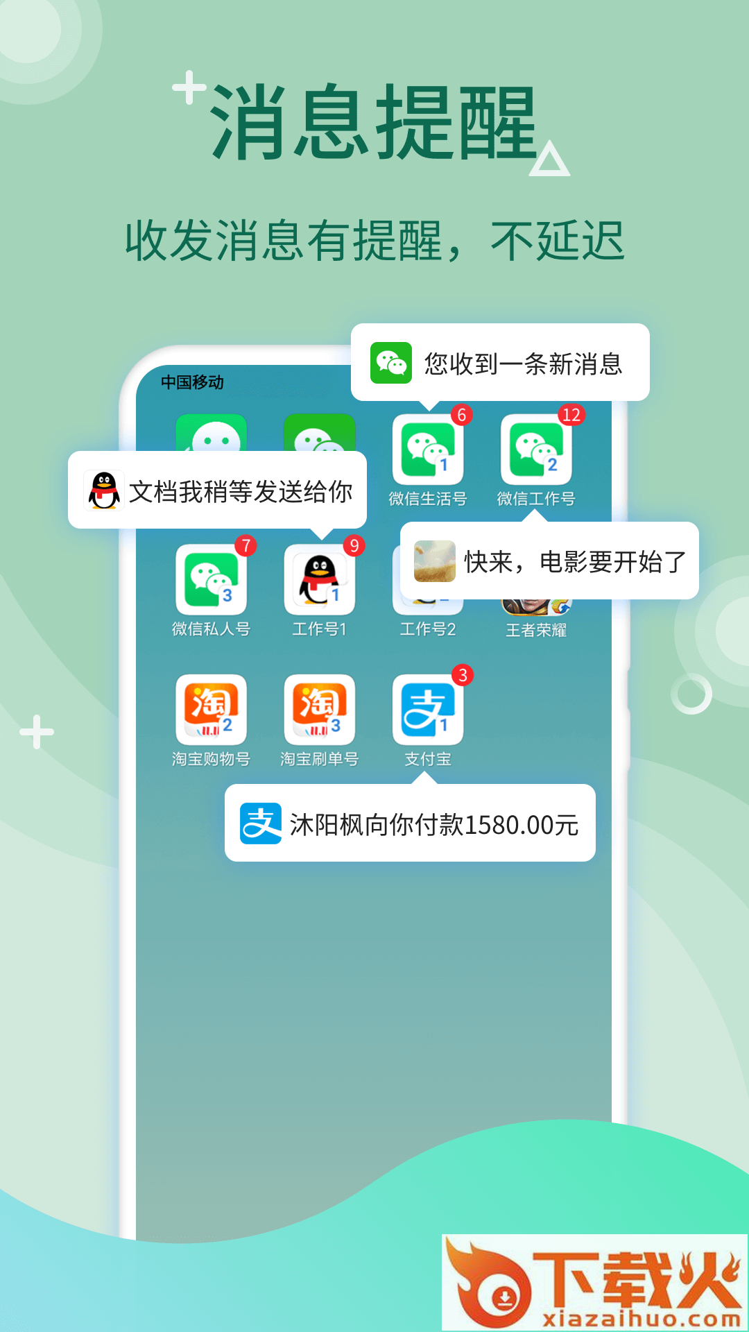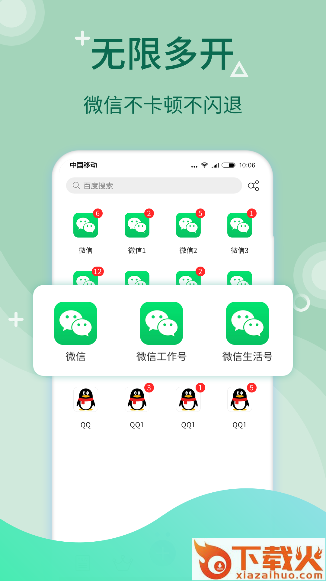 微信多开app,用户信赖,无限多开,不封号不闪退;消息提醒,收发消息有提醒,不延迟;桌面图标,分身放置桌面,开启更方便;极速流畅,多个微信,不占内存不卡顿;个性定制,任意设置图标、名称。...