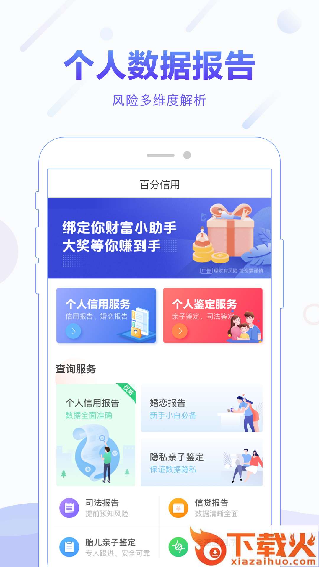 百分信用app,查一查个人风险一目了然;个人数据报告,风险多纬度解析;个人的信用特权,让个人信用产生价值;个人隐私保护,MD5+RSA加密算法数据保护。