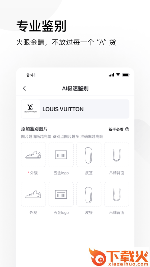 用户只需选择品牌、品类,拍照上传鉴定点图片,就可以秒获客观、准确的Al鉴定报告。
