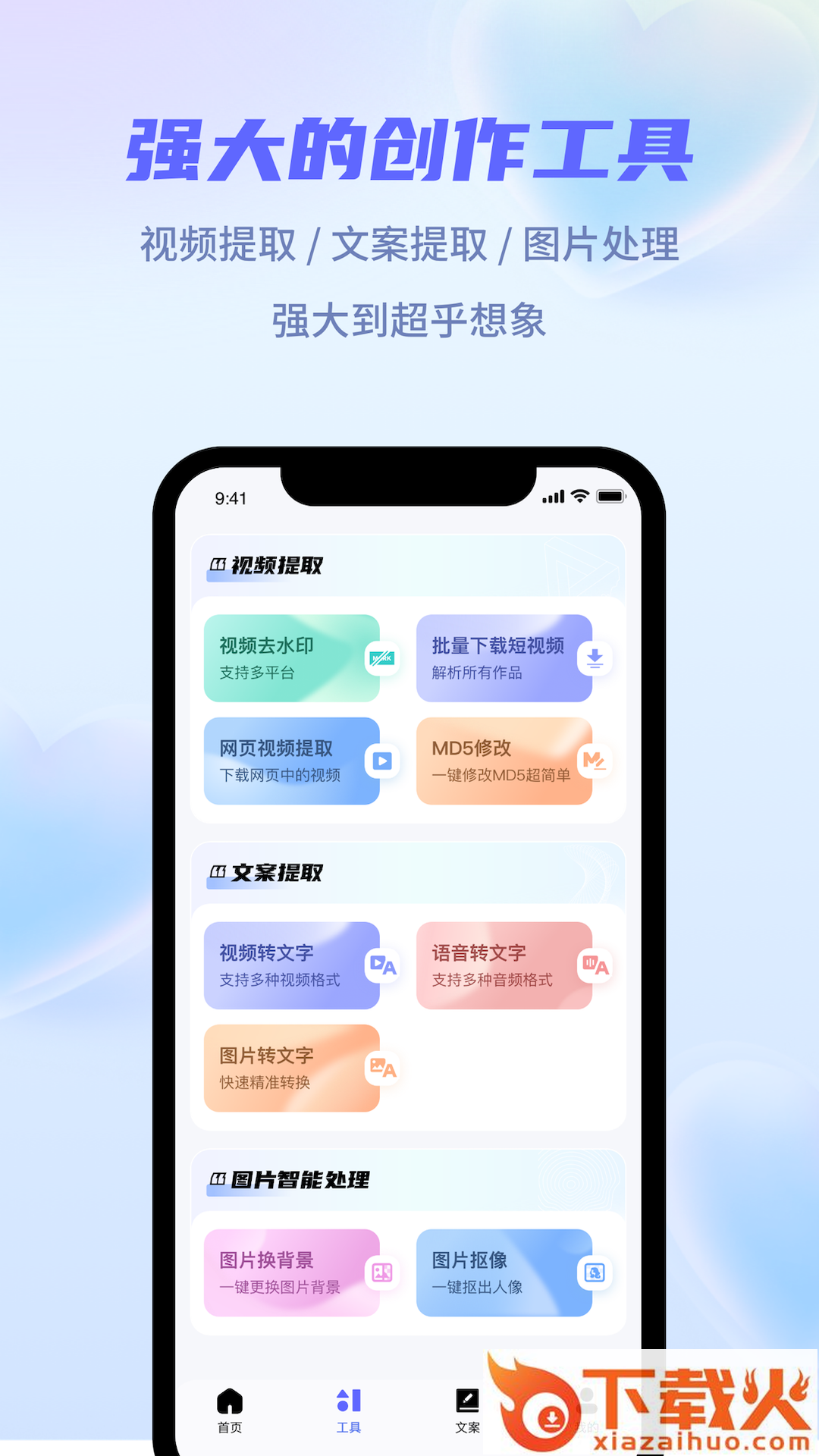 视频去水印,MD5修改,视频转文字,语音转文字,人像换背景与抠像,众多创作工具助你一臂之力。