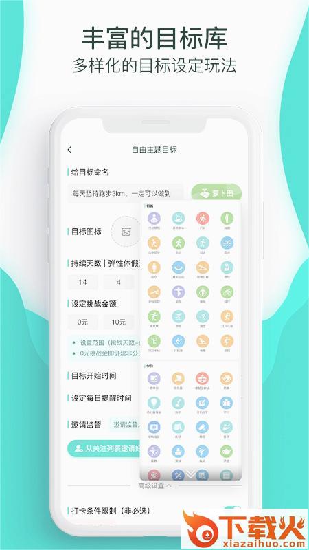 1、灵活的目标场景――挑战目标自拟,支持读取相册照片作为图标,目标持续天数与弹性休假次数灵活规划,可设定每日定时提醒,还可通过设置目标挑战金发起公开挑战。