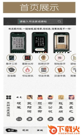 1、碑帖单字。把经典书法碑帖截成单字图片,配上米字格,每页展示一张,更方便、更准确的在手机端读帖、临帖。
