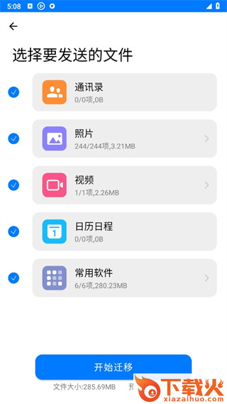 3、旧机发送的用户勾选上需要发送的文件后点击【开始迁移】;
