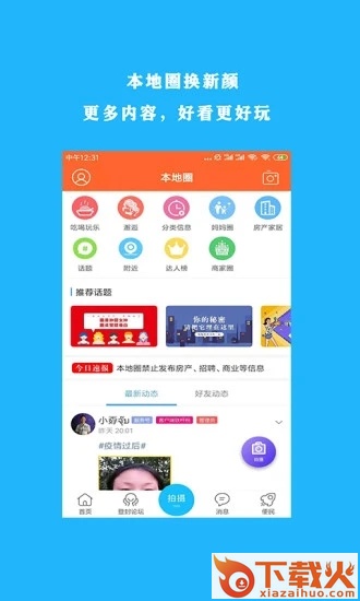 6、进入本地圈,,可以随时进行拍摄、查看话题、招聘等操作