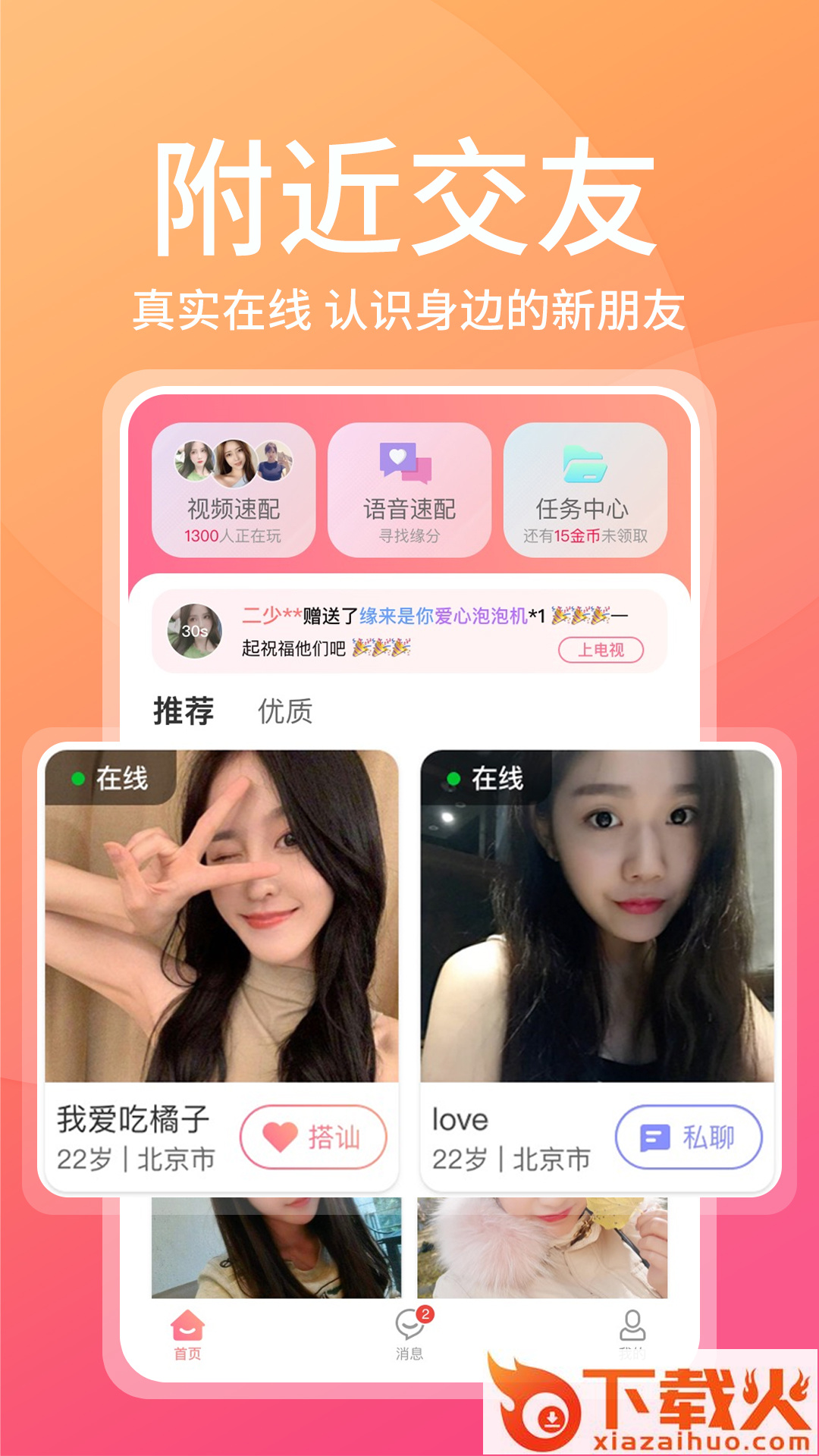 附近甜蜜聊app下载,一款有趣有料的视频交友互动平台,来附近甜蜜聊app大家可以随时搭讪附近的人,在线聊天互动,同城交友约会,有需要就来下载。