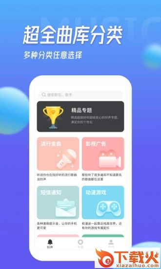 海量曲库,超全分类,时下热门歌曲,流行网络神曲,原创、恶搞、动漫、影视,这么多铃声我都随意挑。