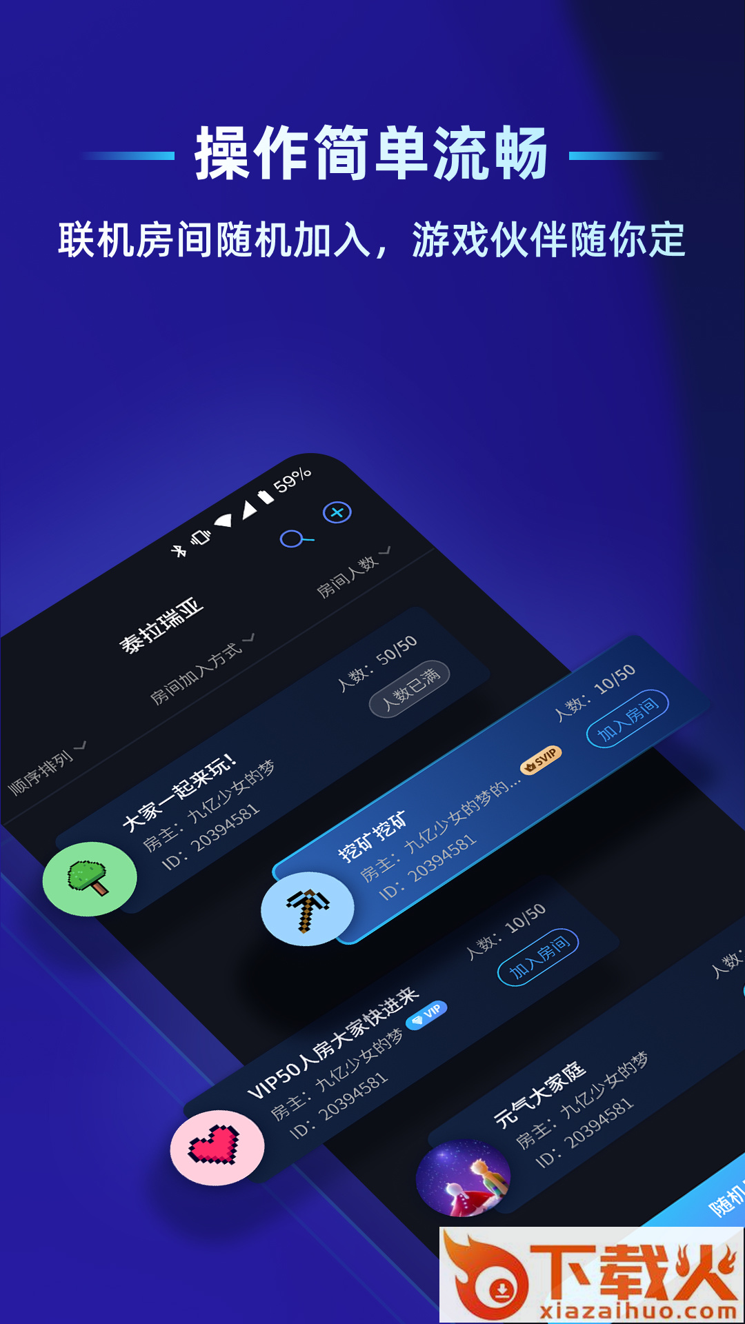 【加入游戏房间】任意选择游戏房间加入或通过搜索房间加入,快速找到游戏伙伴;