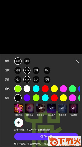 3、点击右下角的【加号图标】可以对方向、速度、字体、颜色、背景进行调整;