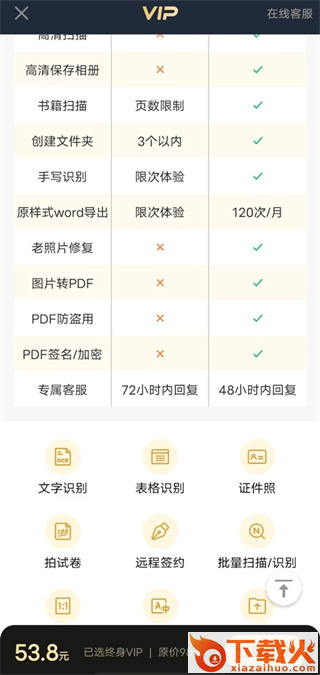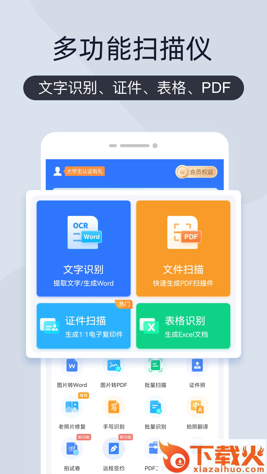 扫描君App,PDF图片转文字简单超实用;多功能扫描仪,文字识别、证件、表格、PDF;图片转文字,快速精准导出Word;文档高清扫描,拍摄文件快速生成高清PDF;证件1:1扫描,导出高清复印件和防盗用;表格识别,纸质表格一键生成Excel。