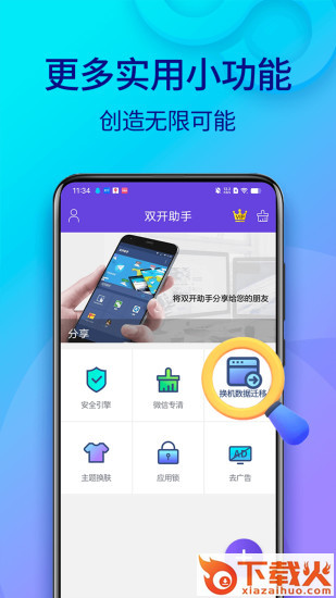 2、无限应用多开分身 全球首 创应用多开分身功能,支持微多开、派派多开、淘宝多开、闲鱼多开等,依托独有内存管理机制,手机无限多开不卡顿。