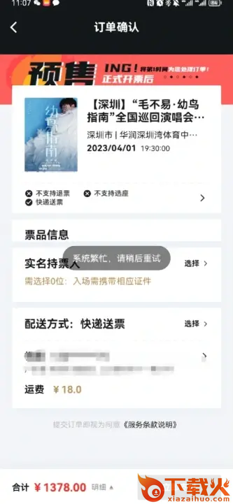 抢票前看了很多攻略,最后以最快的速度点了立即购票,然后就在这个页面卡了很久,一直点刷新点了几分钟,没用,正确的做法应该是后退回立即购票那个界面,再重新进来。