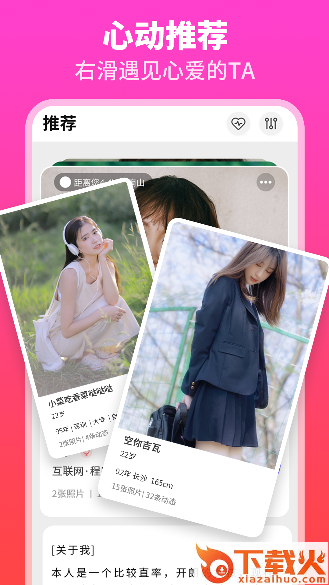 【心动推荐】当你的资料完善后,系统会根据你的条件、爱好、恋爱观等特征进行匹配,匹配到和你属性相近的人,能帮助你在共同爱好里找到适合的那个Ta