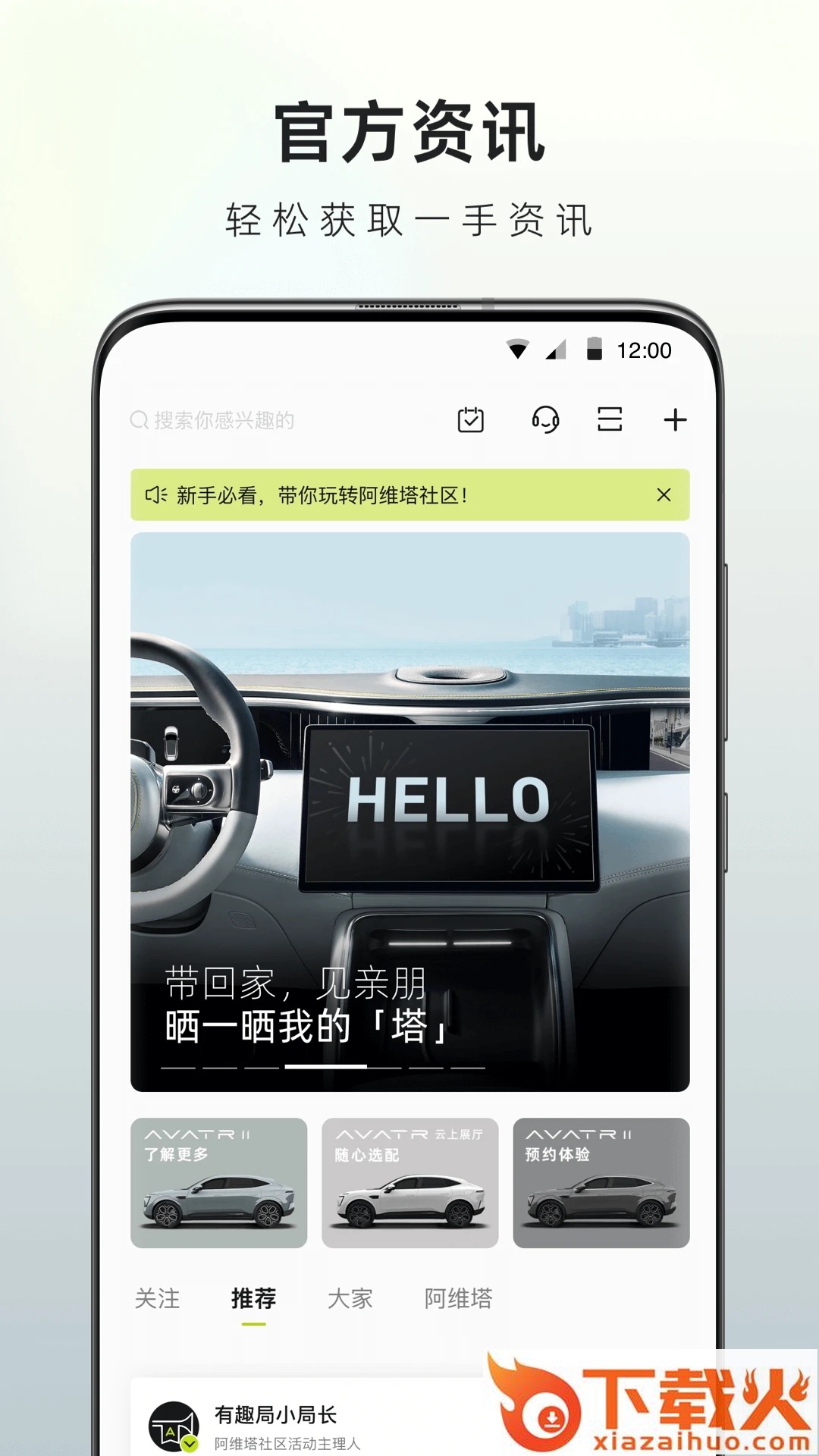 阿维塔app是一款由阿维塔科技(重庆)有限公司开发的资讯软件,软件内拥有很多官方最新资讯,用户可以查询观看,了解这款电动汽车品牌,还能与线上感性的用户讨论交流自己不同的看法,使用非常简单。