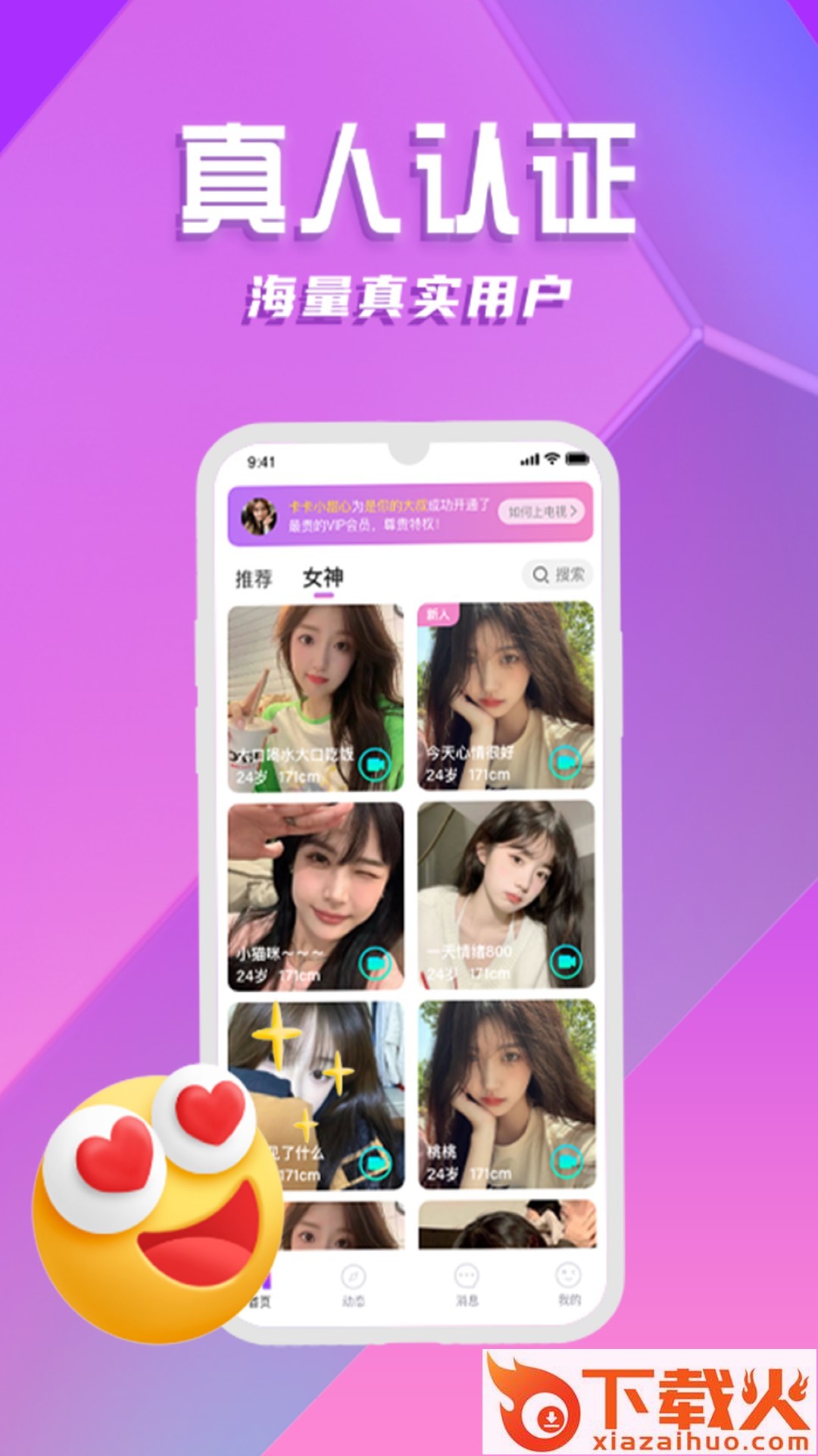 海量颜值女生,实名认证,真人视频记录,展示自我,拒绝照骗,真实交友。