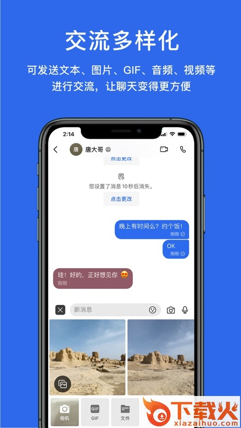 以端对端加密的方式发送文本、图片、GIF、音频、视频进行互动交流,让聊天安全无处不在。