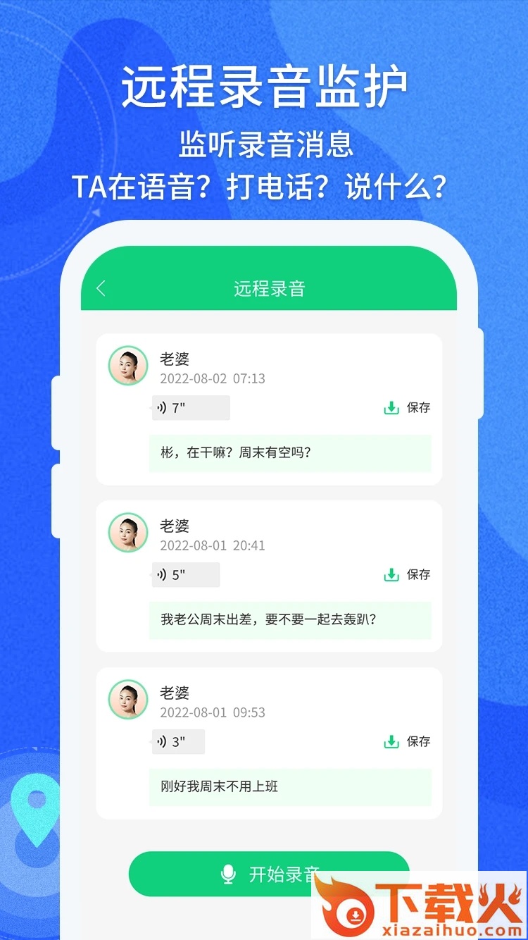 • 远程录音:通过手机远程录音,时刻掌握亲友周边环境情况,保护TA的安全;