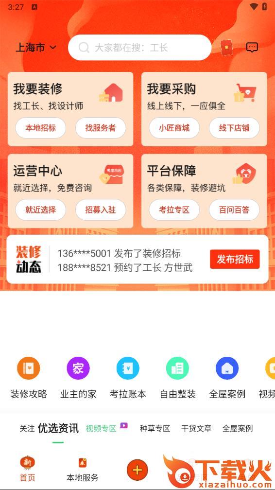 业主发布装修需求,服务者(工长、设计师 和 监理)前来竞标,业主联系竞标服务者免费上门量房报价;