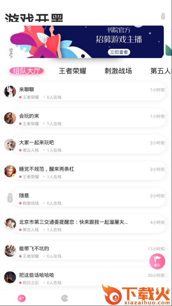 书院语音app,一起来这里开黑吧。组队互动,大神带你上分啦,游戏开黑包括了王者荣耀,刺激战场等等内容,主播们也可以来这里哦!...
