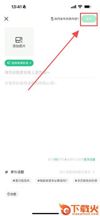3、进入发布界面,添加照片、填写标题、输入文本心得、选择话题,点击右上角【发布】按钮即可完成操作
