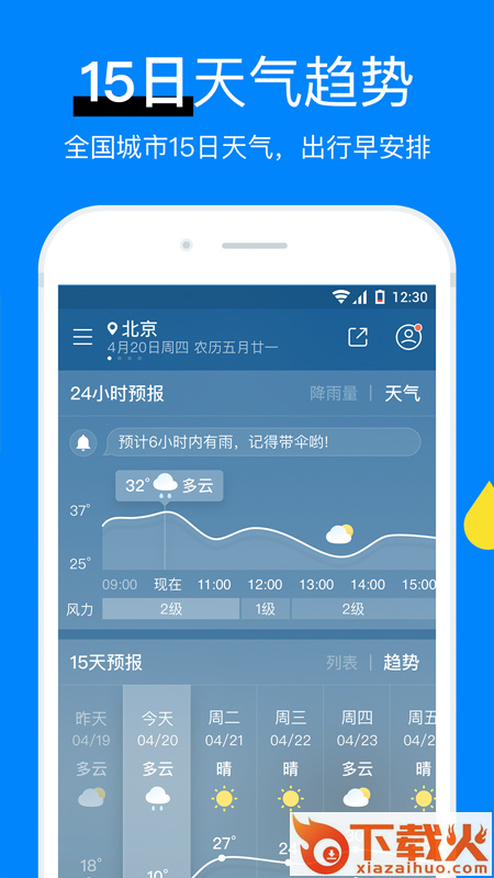 *完备的天气信息:15日天气预报、24小时天气预报、空气质量指数、空气污染指数、pm2.5、风力、湿度、温度、日出日落、气压、能见度、根据当日天气状况提供相应的生活建议,紫外线、钓鱼指数、穿衣指数、洗车指数、感冒指数、运动指数、旅游指数一手掌握!