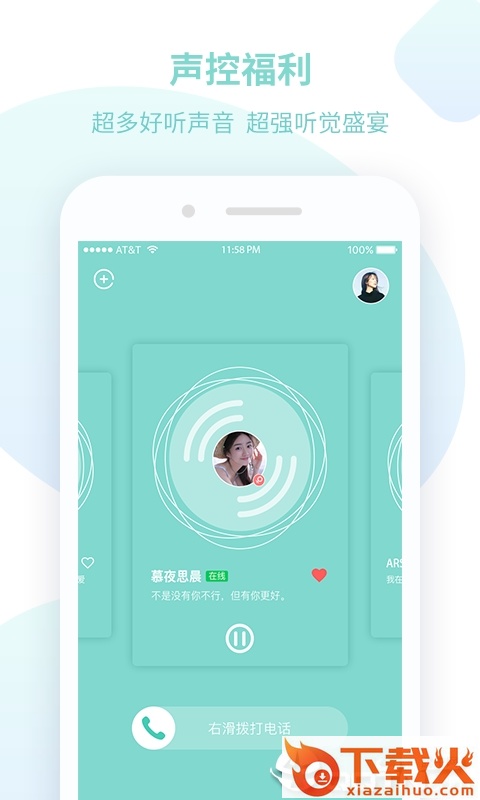 快速的声音速配流程,1V1的语音聊天方式,轻轻一划,开启你的声音之旅。