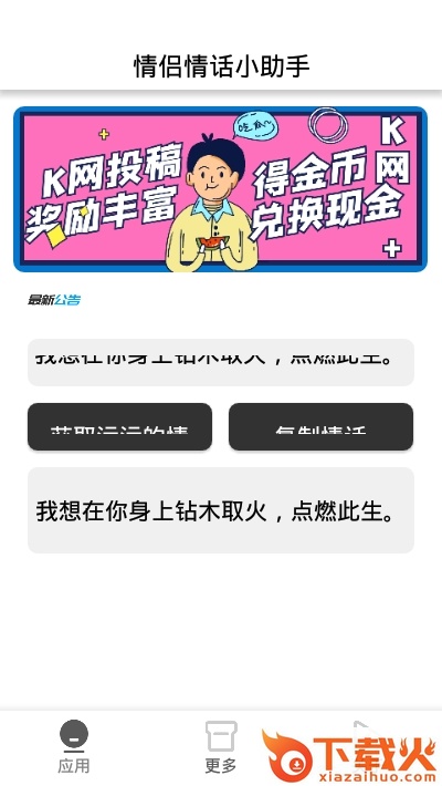 情侣情话小助手app是一款非常有趣的手机恋爱助手软件,这里拥有最新最火爆的恋爱话术,各种套路小技巧帮助您提高魅力,喜欢的小伙伴不要错过哦,快来点击下载安装吧!
