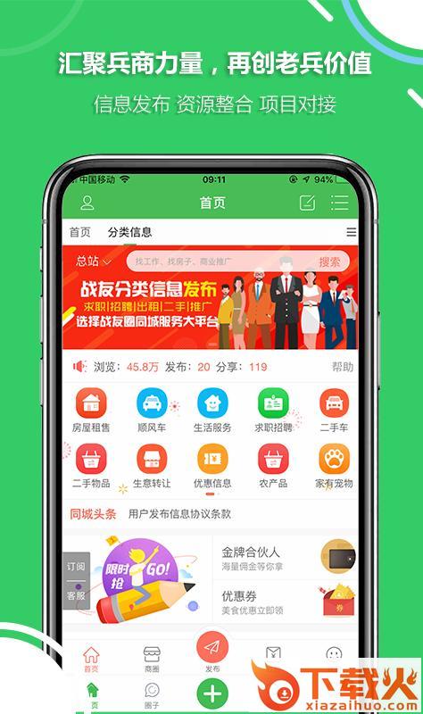 战友圈app,专为退役军人打造的社交平台。百万战友的社交生活圈子,为用户提供热点新闻、退伍政策、联谊活动,商业信息,还有同城社交,战友等你来聚。