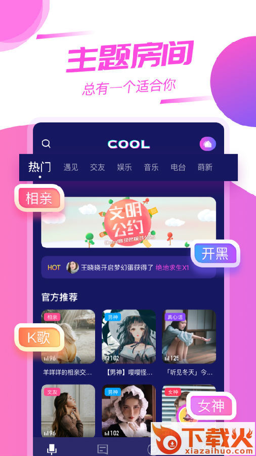 CooL语音app,玩法多样的语音交友软件,多人语音畅聊,畅快互动,带给你更多欢乐。下载CooL语音app,多种语音交友玩法随你体验,海量精彩内容带给你更多乐趣。...