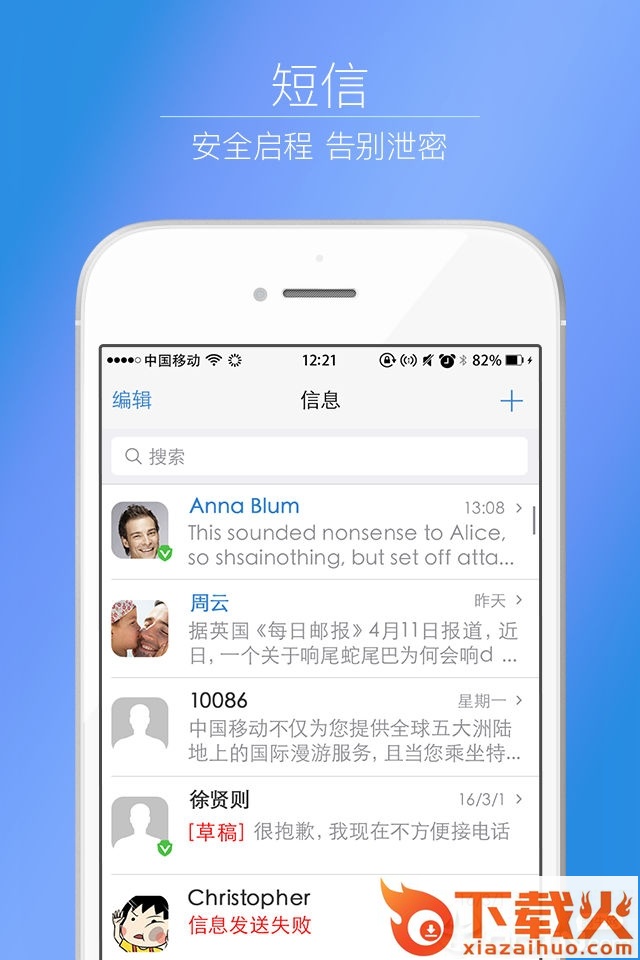 【短信】通过三端加密告别信息泄露,可在聊天中发送文字、语音、图片、视频、名片,短信记录实时与云端同步