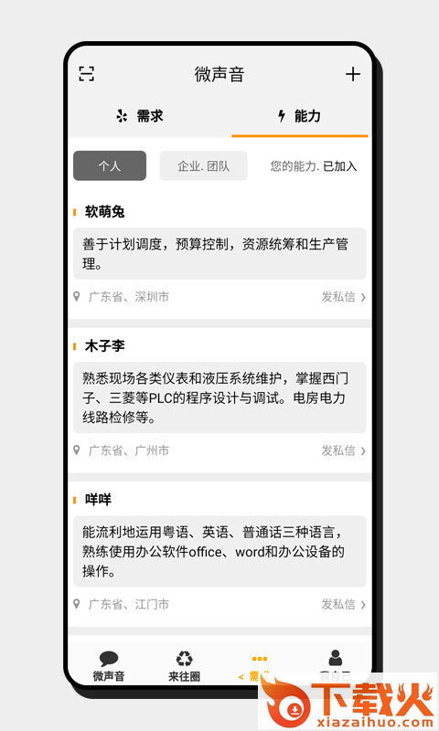 所有用户都能够在微声音上了解到个人、团队或者企业的能力、 专长信息,不再需要中介,轻轻松松就可以找到不同能力的人才、或不同行业的 企业。