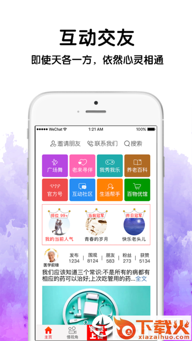 《退休公社》,是一款专为退休人量身打造的表达情感、维系社交、追求健康的手机终端科技产品。它通过发布分享、文化娱乐、互动交友、生活购物、人气排行、个人中心等诸多功能,让中老年人即便足不出户,也能观美景、交朋友、保健康、学养生、逛商城、品情怀,兼具满足精神和物质双重需求,尽享同龄人圈层带来的快乐和陪伴。