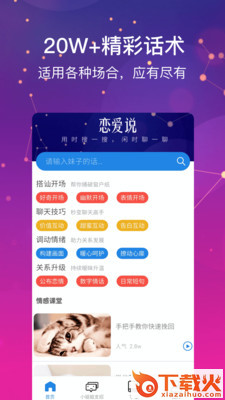 恋爱说app是一款非常受欢迎的恋爱话术软件,这里有上百万条恋爱话术,让你轻松读懂女生话中的隐藏含义,还能查看恋爱实战经验,在线学习话术的运用情况,帮你撩女神,哄女朋友,赶快下载体验吧!