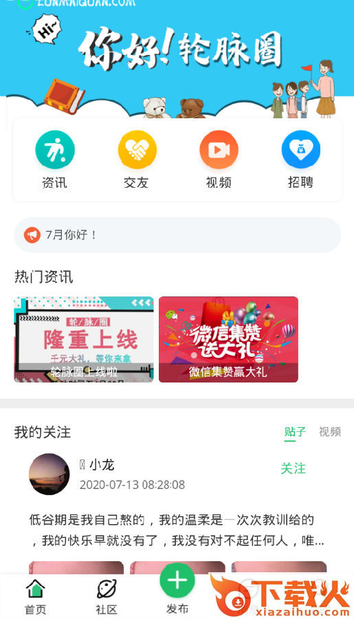 轮脉圈app是一款专注于残疾人的交流平台,在这里可以一起分享交流,互利互助,还能在线分享一些工作岗位等,行业相关资讯内容也是即时推送,非常不错,有需要的欢迎前来下载!
