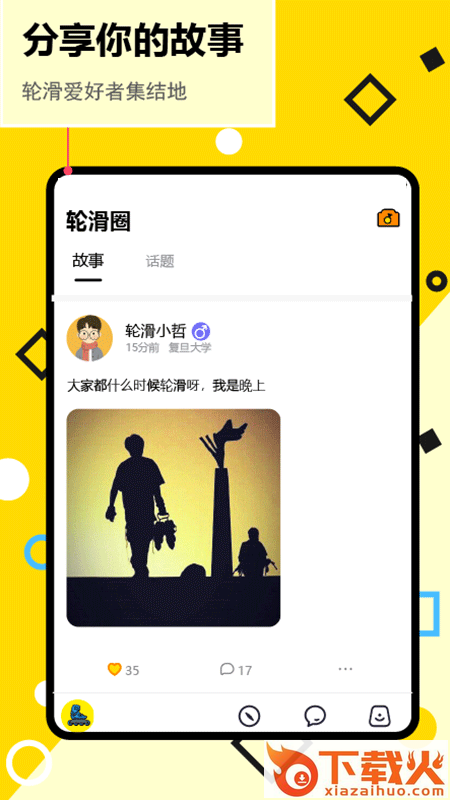体验踩在轮子上的快乐!无论你什么时候开始穿上轮滑鞋,也无论你技术如何。只要你热爱轮滑,我们就是一类人。用户短视频、图片、声音记录你的日常,把轮滑的快乐分享给身边人。