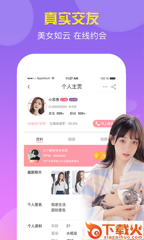 实时动态:即时聊天,在线交友,告别“尬聊”,免费简短视频个人秀,个人展示照片合集,让您更真实的选择到喜爱的心动女神。